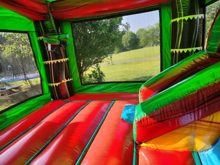 This bounce house has a slide that can be used wet or dry. It also has a basketball hoop inside for extra fun.